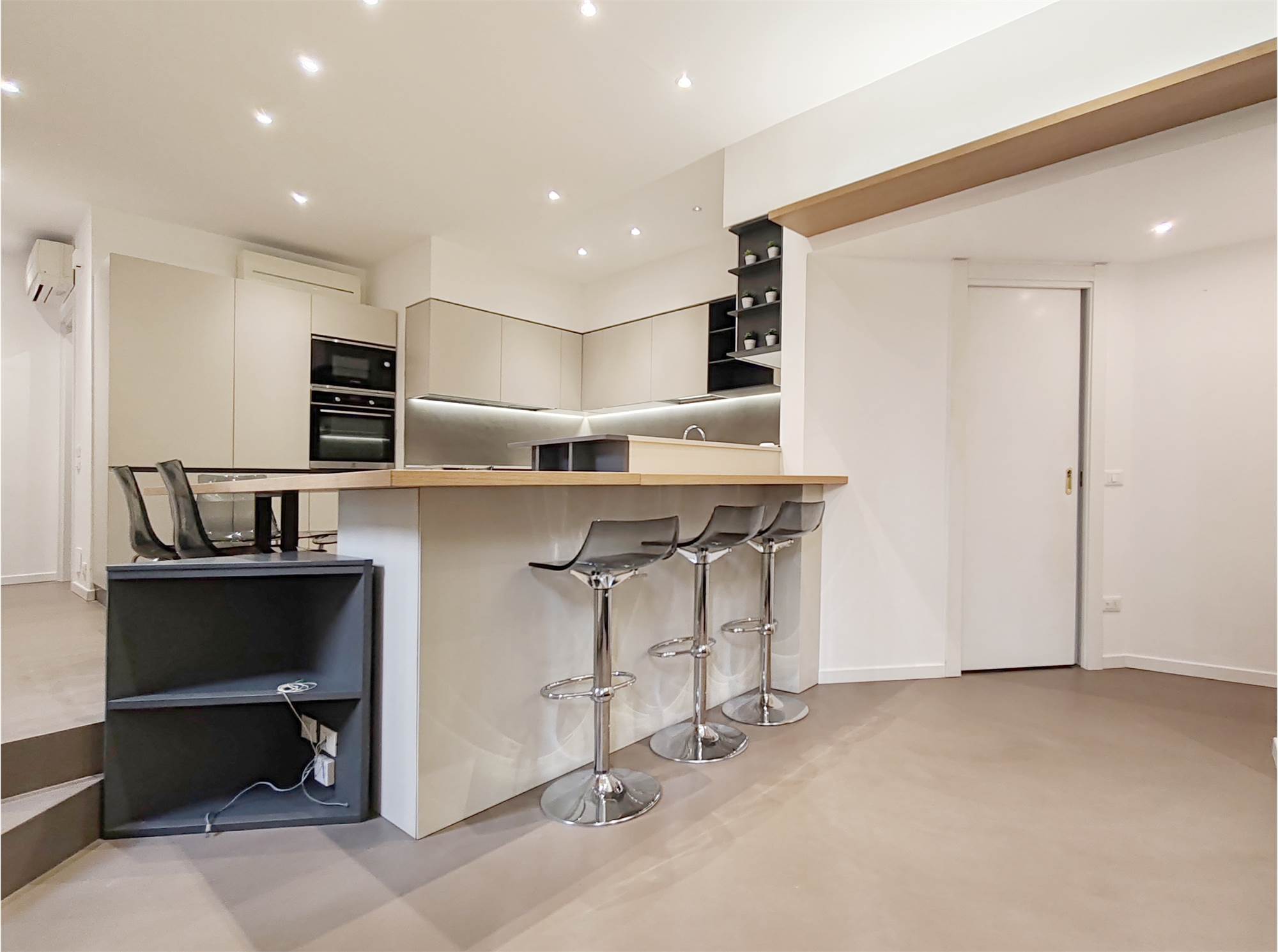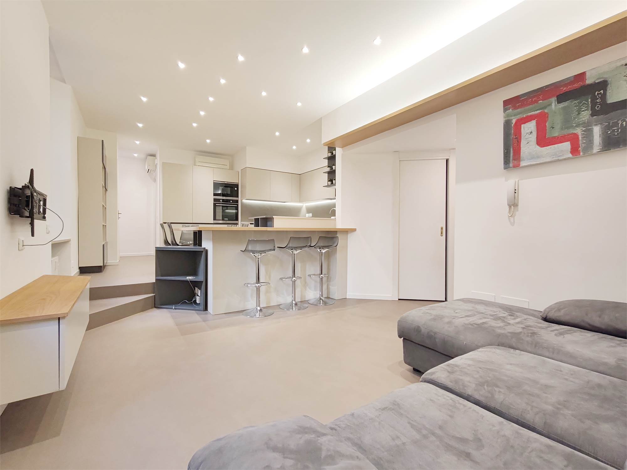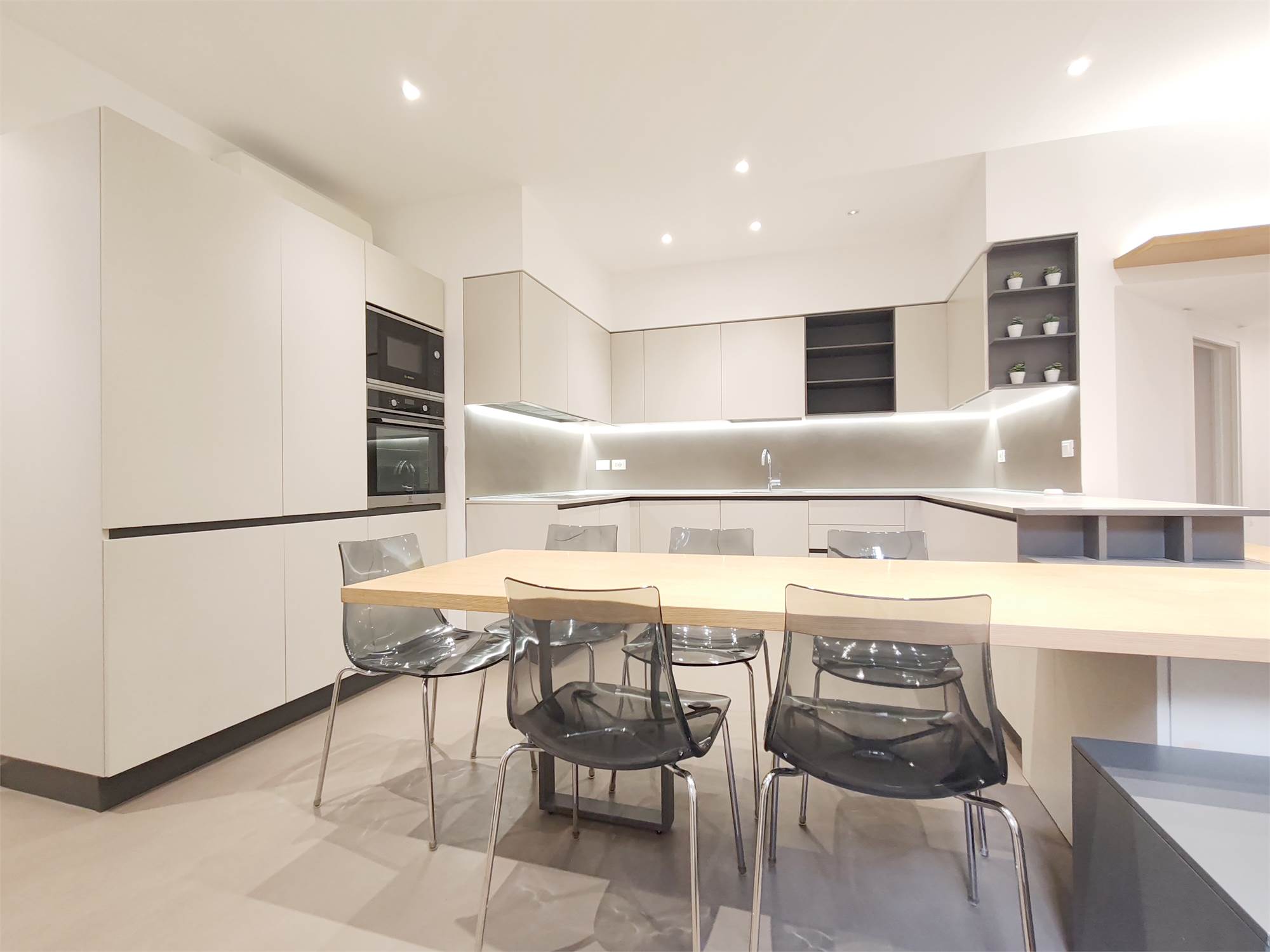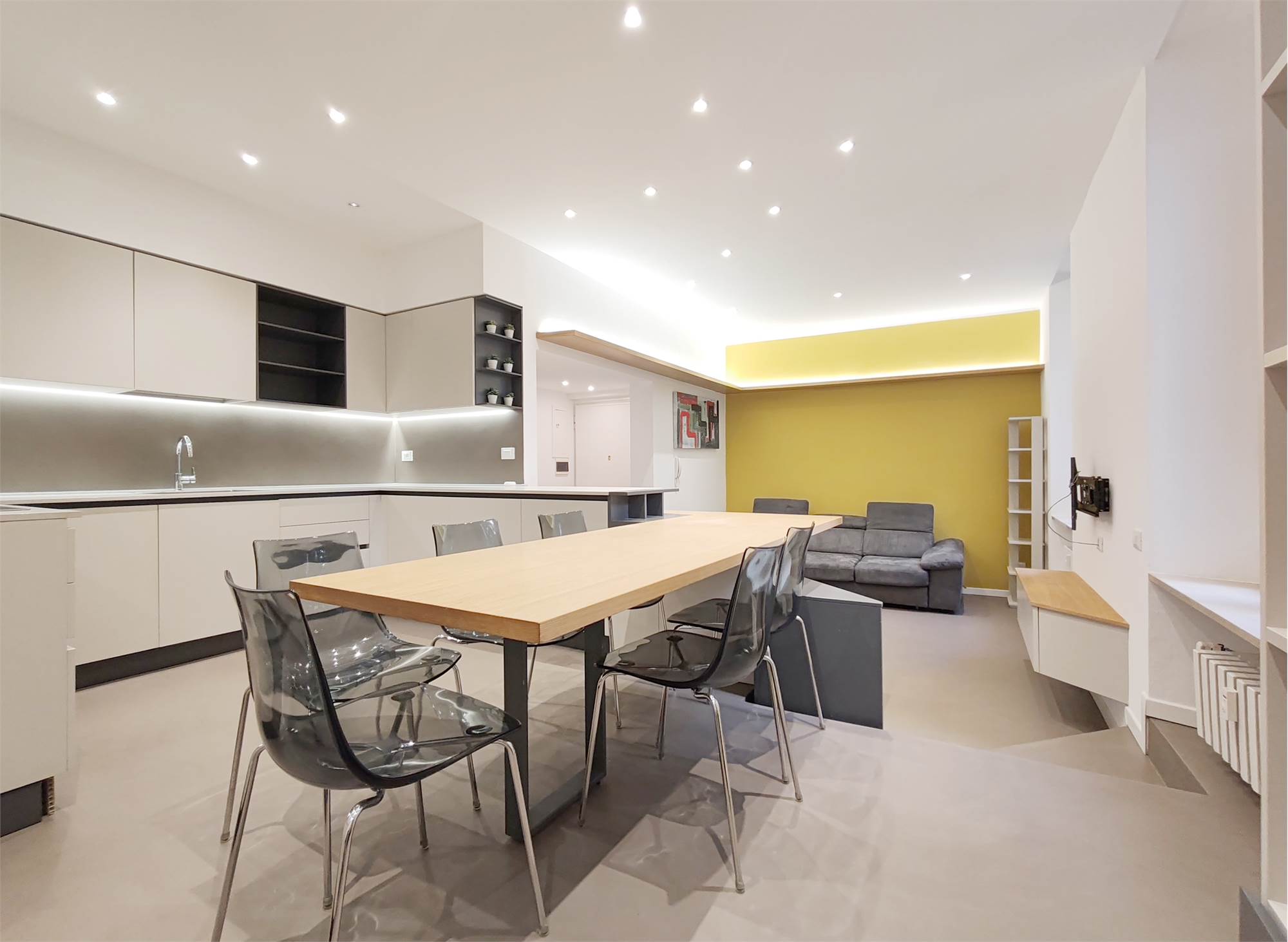 L’appartamento si apre su un’ampia zona giorno che scorre fluida dalla parete attrezzata al grande bancone della cucina. Le superfici sono pulite, le linee essenziali, le luci puntuali su ogni locale.