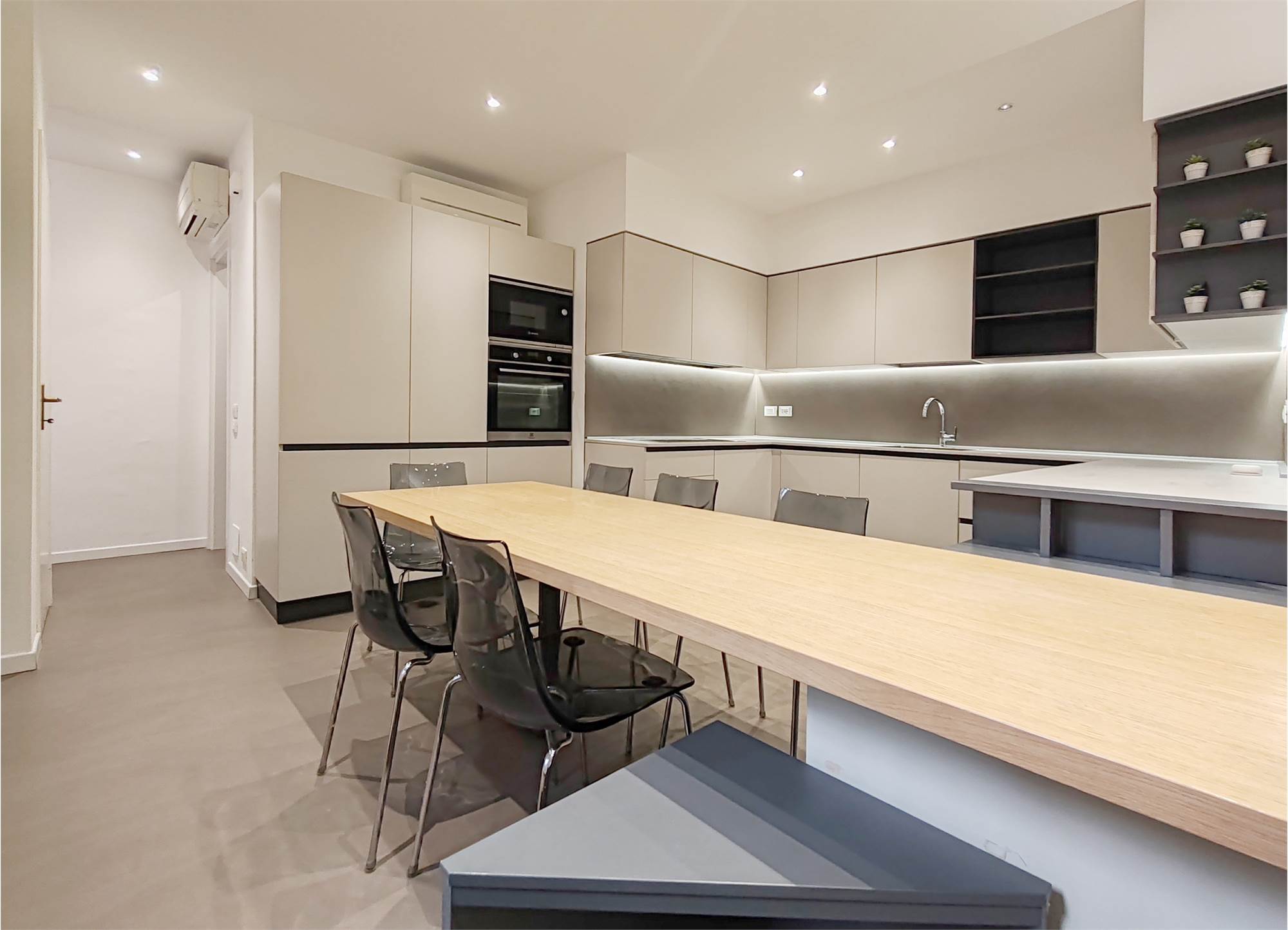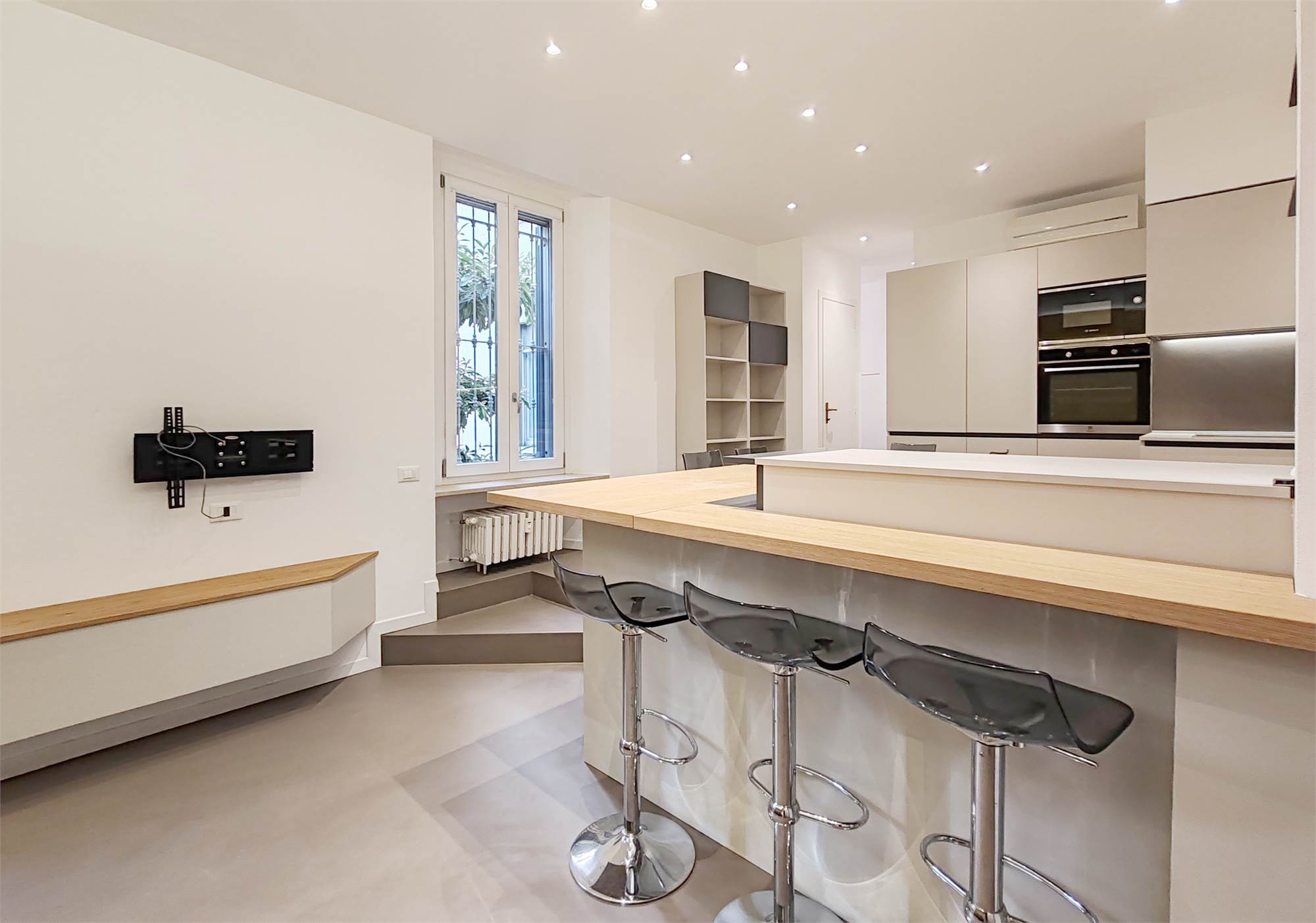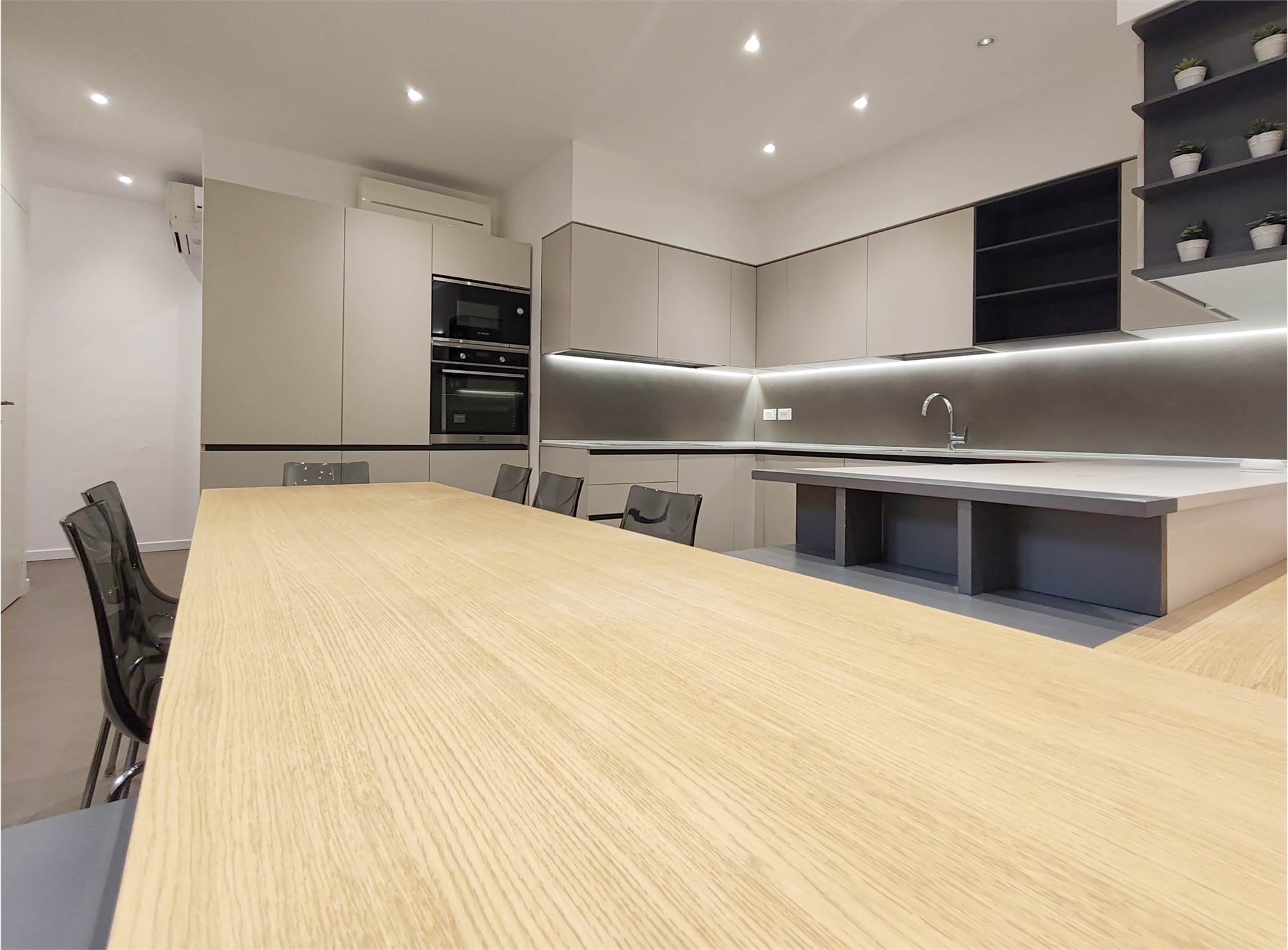L’appartamento si apre su un’ampia zona giorno che scorre fluida dalla parete attrezzata al grande bancone della cucina. Le superfici sono pulite, le linee essenziali, le luci puntuali su ogni locale.