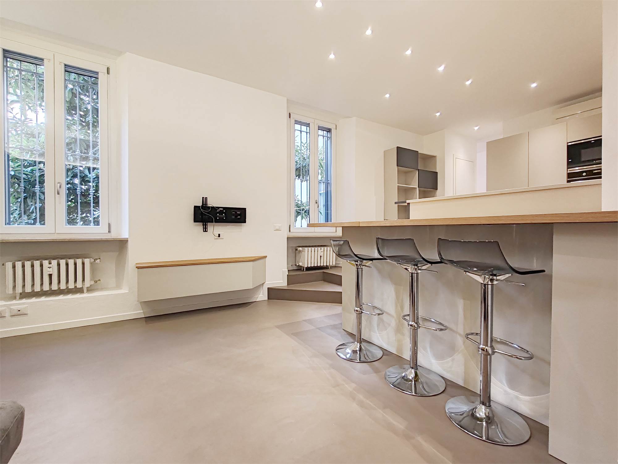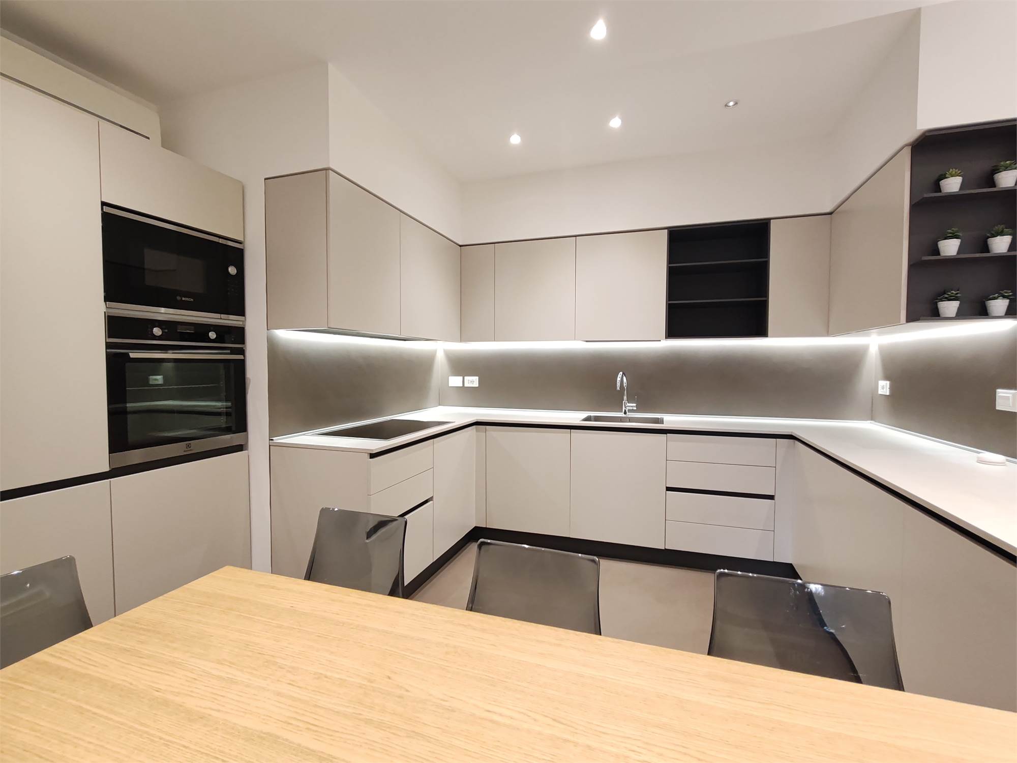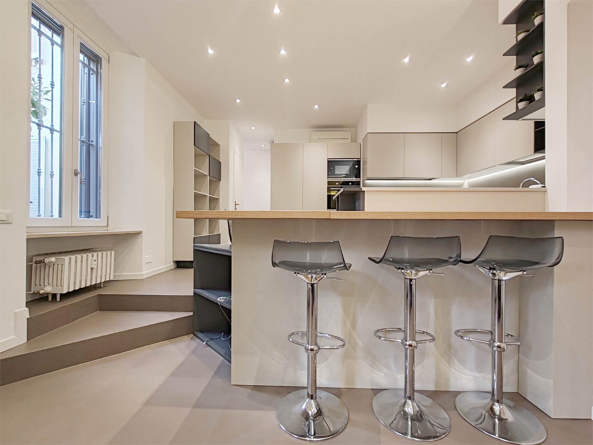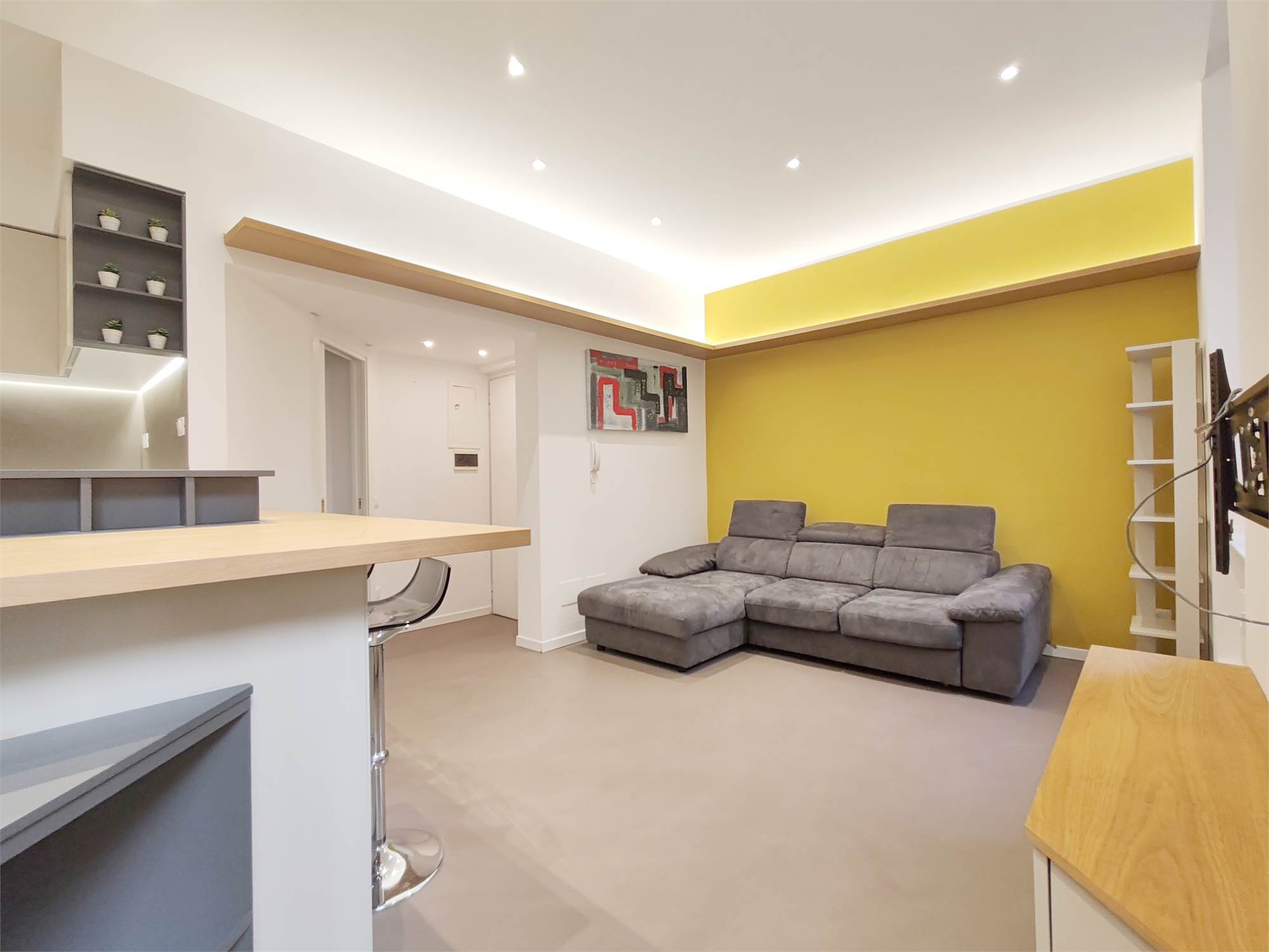 L’appartamento si apre su un’ampia zona giorno che scorre fluida dalla parete attrezzata al grande bancone della cucina. Le superfici sono pulite, le linee essenziali, le luci puntuali su ogni locale.